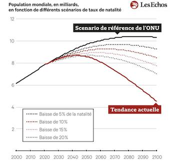 La France rejoint donc la tendance mondiale d’emballement de la dénatalité qui s’écarte des scénarios pourtant baissiers envisagés. Au rythme actuel, la population mondiale pourrait être divisée par 2 à la fin du siècle (4Mds vs 8). Seule la population de l’Afrique et de certains pays d’Asie (hors Chine) continuant à croître (à rythme moindre néanmoins), l’Europe perdant elle 400M d’habitants (+de 50% de sa population actuelle). Vertigineux.